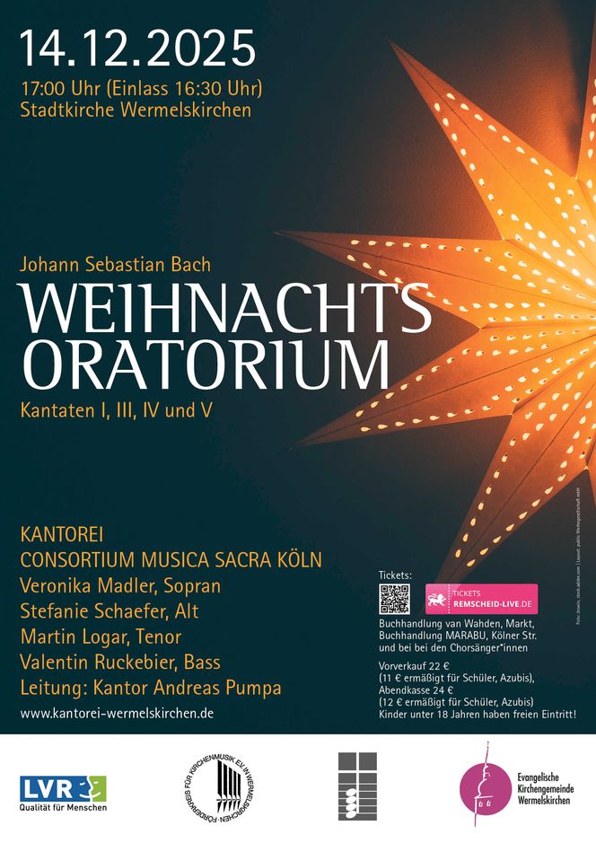 Großes Weihnachtskonzert 2025 der KANTOREI und Gastsänger*innen, Barockorchester CONSORTIUM MUSICA SACRA KÖLN, den Solisten Veronika Madler (Sopran), Stefanie Schaefer (Alt), Martin Logar (Tenor), Valentin Ruckebier (Bass), Gesamtleitung: Kantor Andreas Pumpa