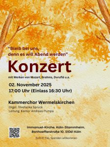 „Bleib bei uns, denn es will Abend werden“ mit Werken von Mozart, Brahms, Duruflé u.a. in der Immanuel-Kirche Köln-Stammheim, Bonhoeffer-Str. 8, 51061 Köln